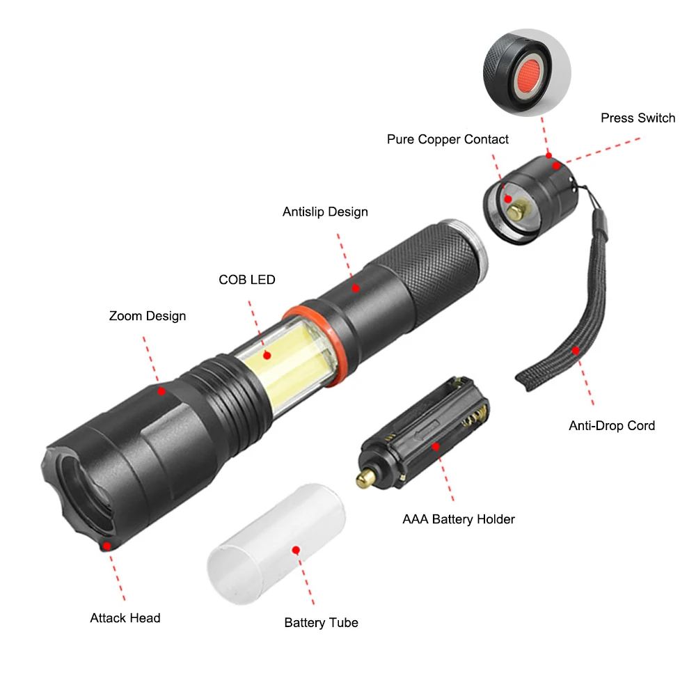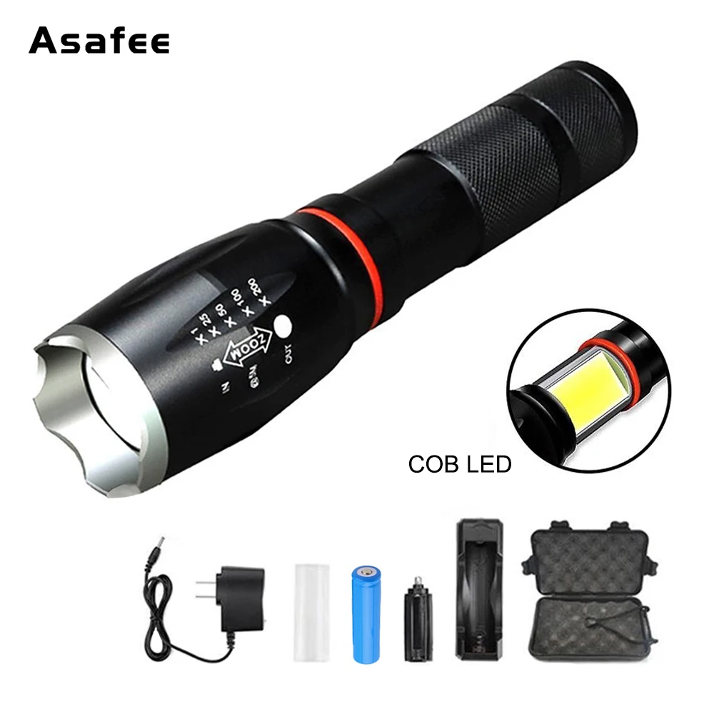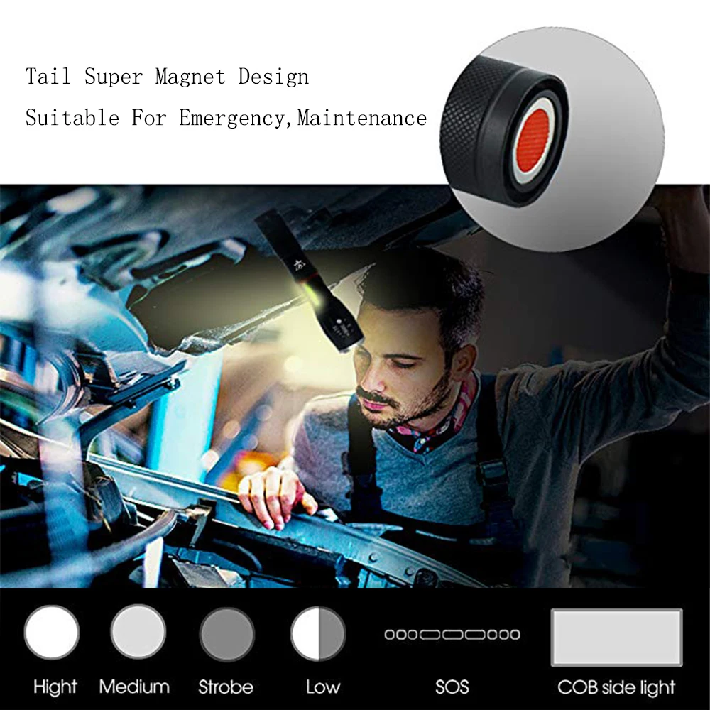 Dropshipping LED flashlight side COB lamp design T6 350 lumens Zoomable torch 6 light modes for 186